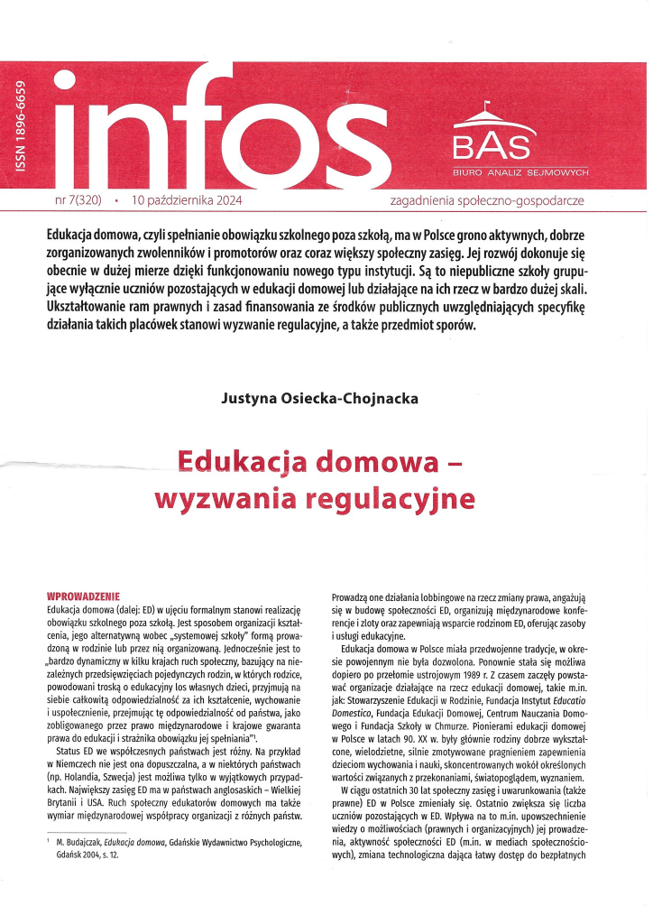 Autorka artykułu, Justyna Osiecka-Chojnacka, pisze o skali ED i jej uwarunkowaniach, o ramach prawnych edukacji domowej w Polsce i o tym jakie są zagadnienia problemowe w uregulowaniu ED.
